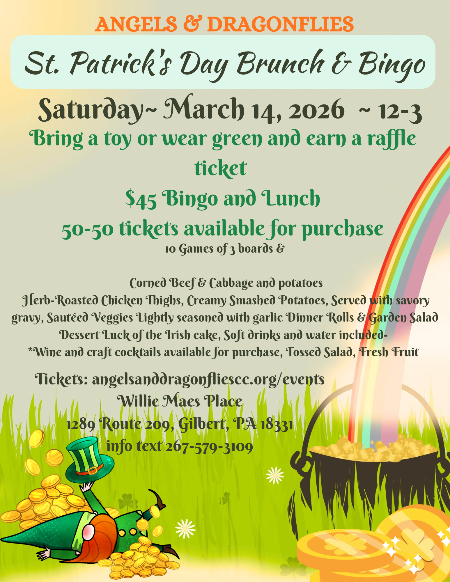🎟️ $45 per person — Includes Bingo and Lunch Bring a toy or wear green and earn a raffle ticket! Join us for a festive St. Patrick’s Day Brunch & Bingo filled with delicious food, fun games, and great company! This adult-friendly event includes 10 rounds of bingo (3 boards per game), a hearty lunch featuring corned beef & cabbage, herb-roasted chicken, creamy smashed potatoes, sautéed veggies, dinner rolls, garden salad, plus dessert. Soft drinks and water are included, with wine and craft cocktails available for purchase. Whether you’re looking for a fun social outing or want to support Angels & Dragonflies’ mission to serve local children and families in need, this event is a great way to connect, celebrate, and give back. 👉 Buy your ticket early — 50–50 tickets available! Text 267-579-3109 for more information.